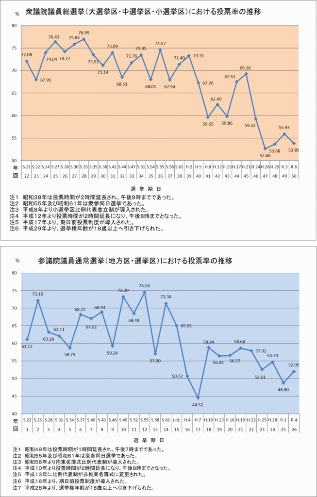 グラフを見ると分かる通り投票率は右肩下がり、50パーセント台が何十年と続いています。